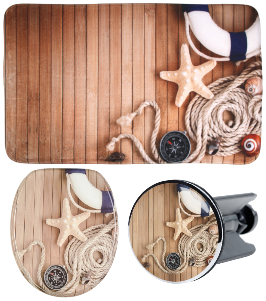 WC-Sitz, Badteppich 70 x 110 cm und Waschbeckenstöpsel