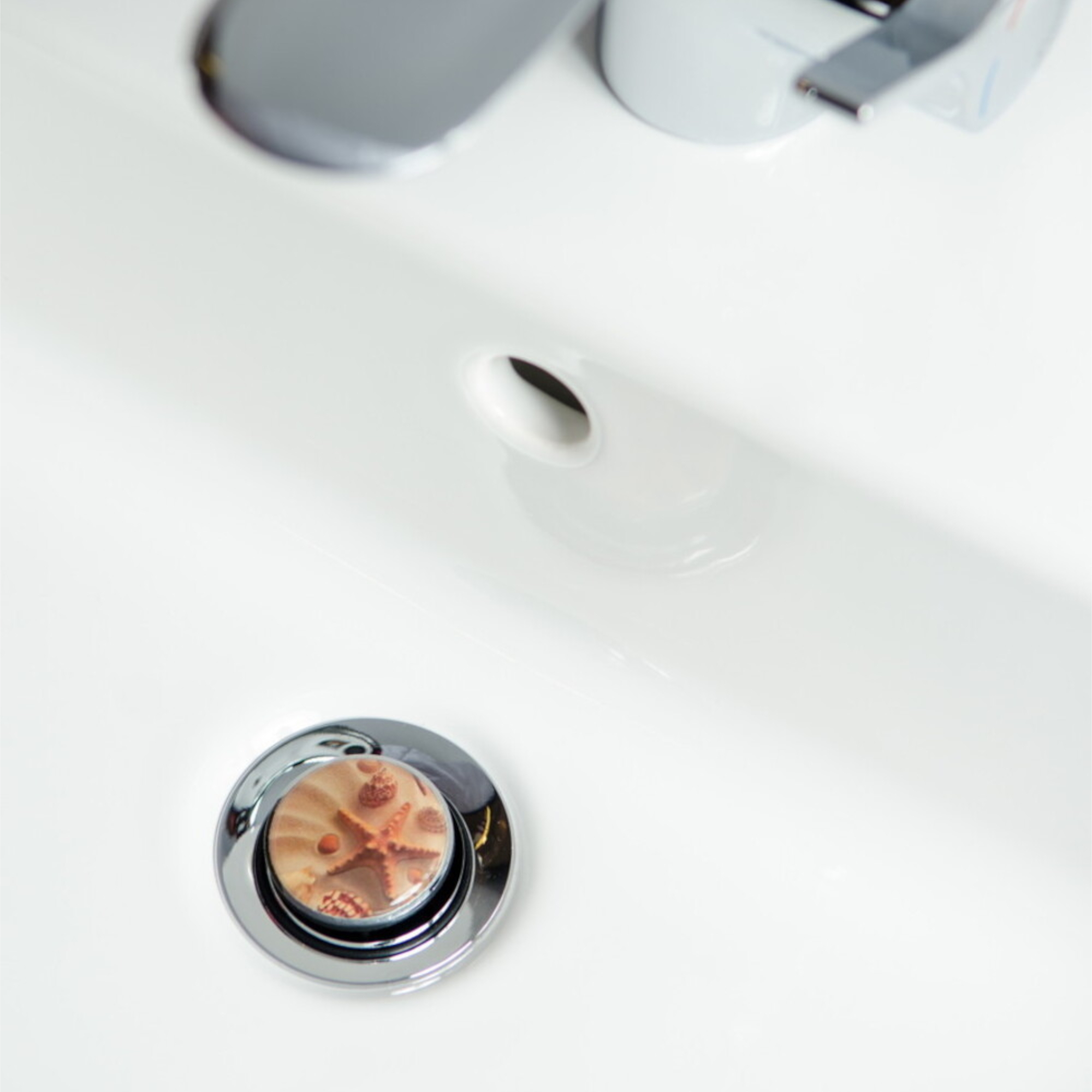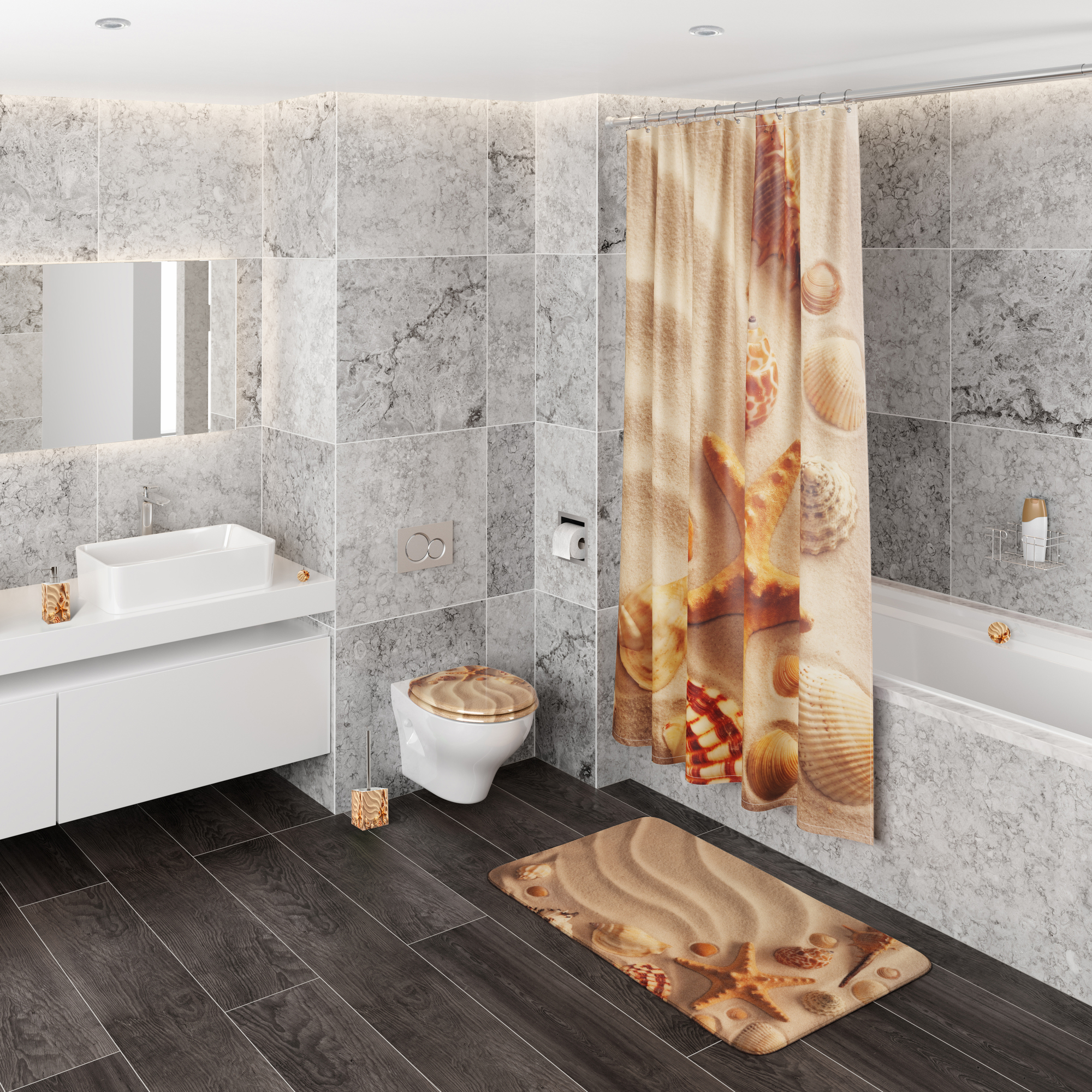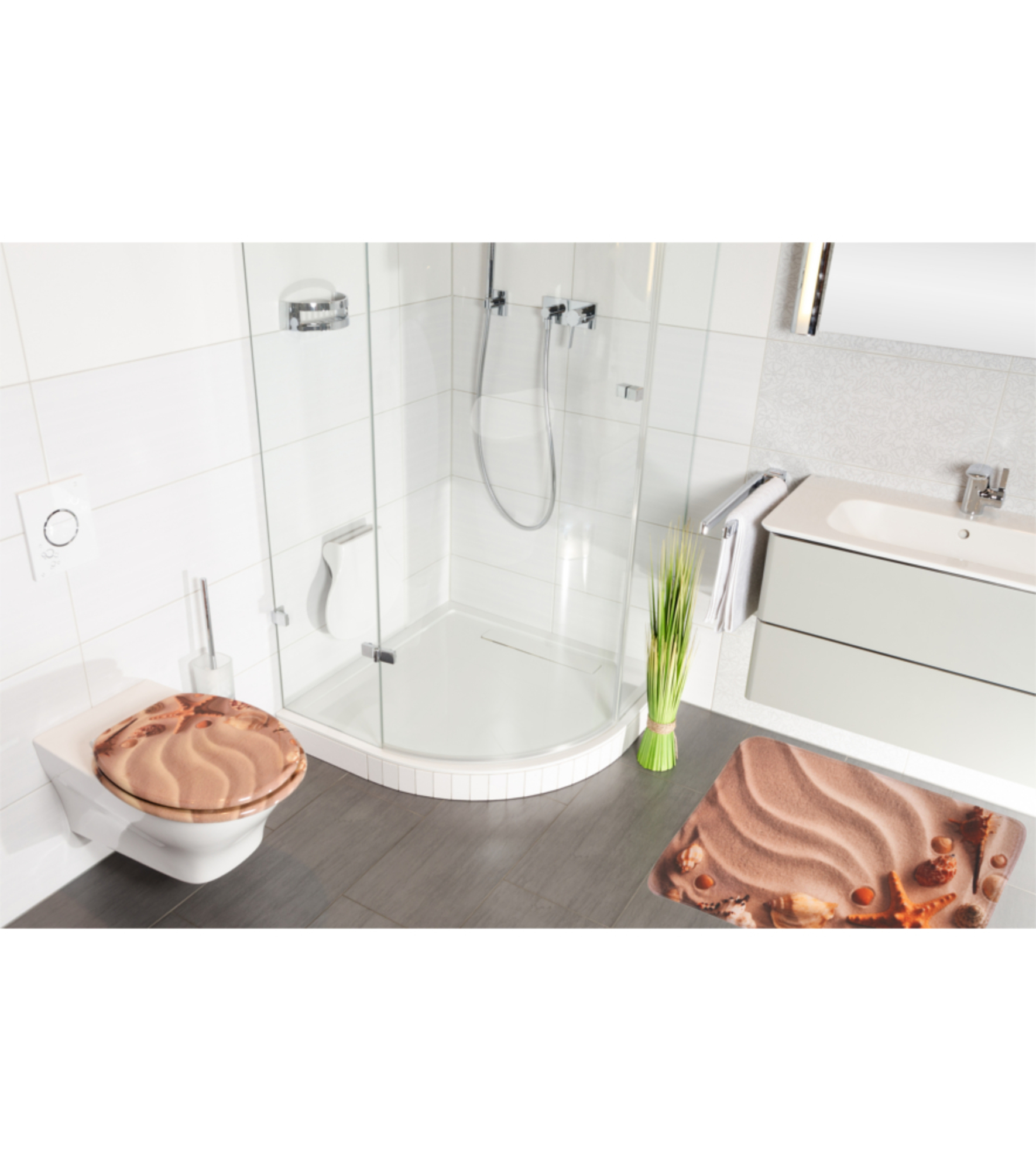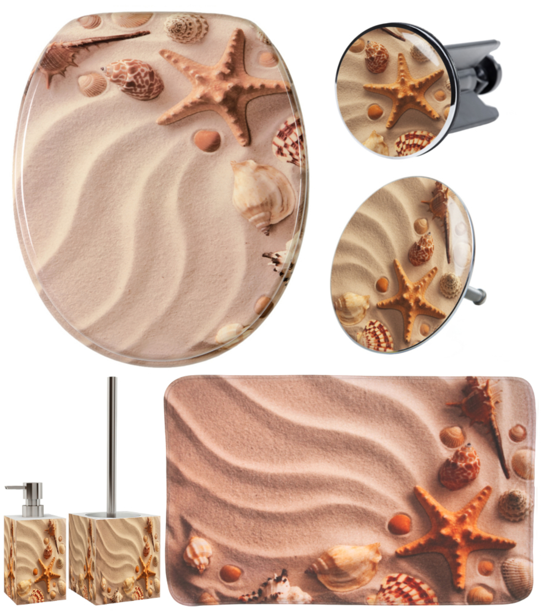 WC-Sitz, Badteppich 70 x 110 cm, Waschbeckenstöpsel, Badewannenstöpsel, Seifenspender und WC-Bürste